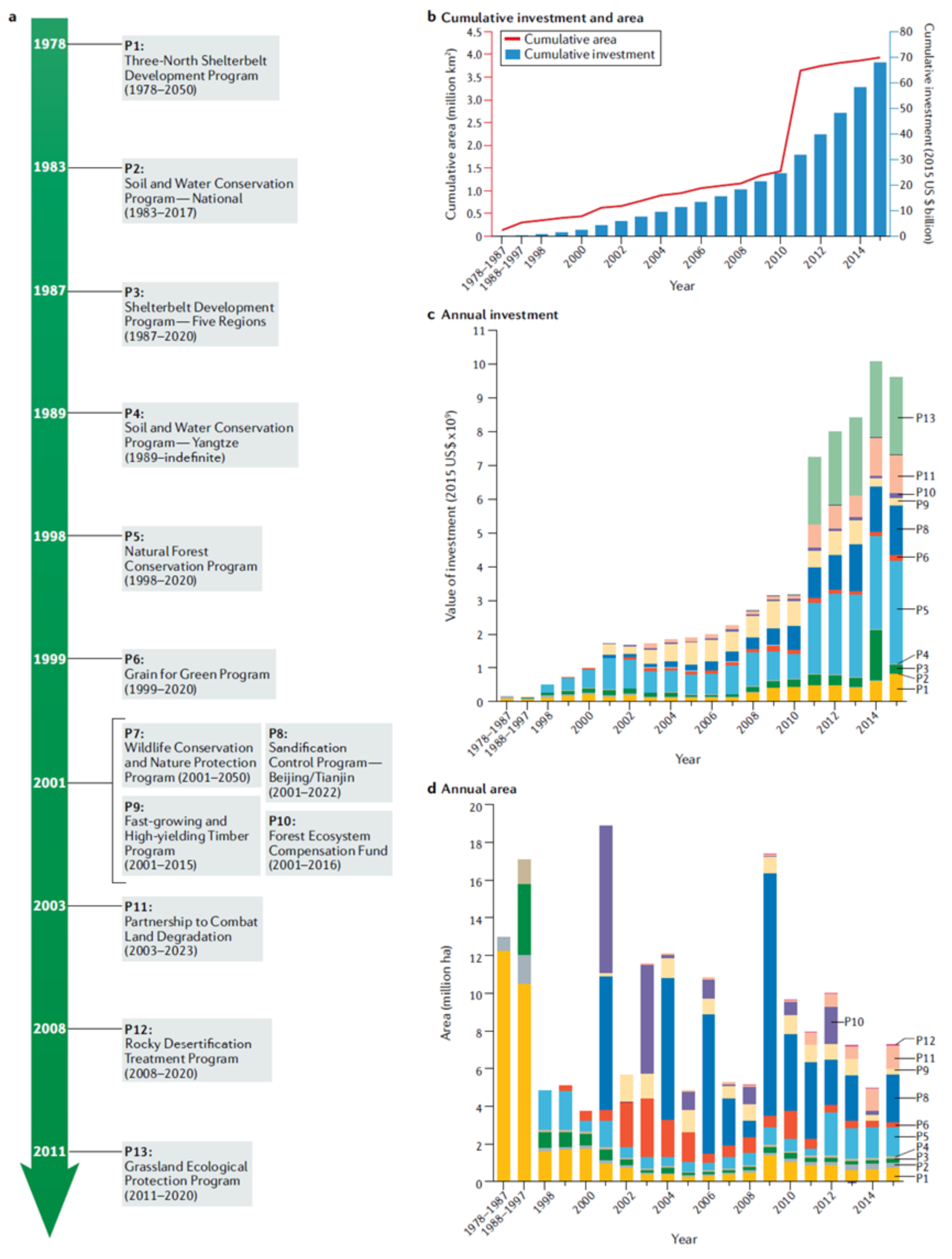 图3. 中国旱区重要生态保护与恢复的工程的投资、规模、覆盖面积等
