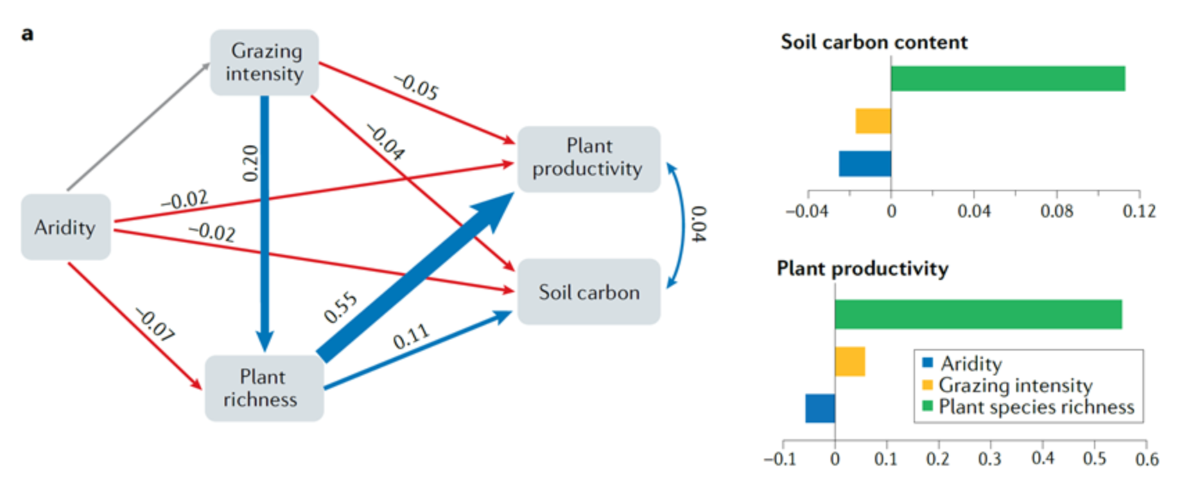 研究结果表明,1982-2015年中国旱区有45.8%的区域呈现植被显著变绿,11.4%的区域植被显著变棕。通过量化旱区生态系统功能变化驱动因素的相对贡献发现,干旱对放牧强度无显著影响,对植物多样性、植被生产力和土壤有机碳呈负向影响。植物多样性对植被生产力和土壤有机碳有正向促进作用(图1)。