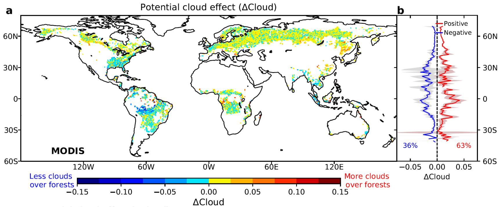 图1 基于 2002-2018年MODIS数据的全球森林对夏季云量的潜在影响及其(b)纬向分布格局。图(b)将云量增强(红色)和云量减少(蓝色)的效应进行了区分,数字显示两者的全球百分比。
