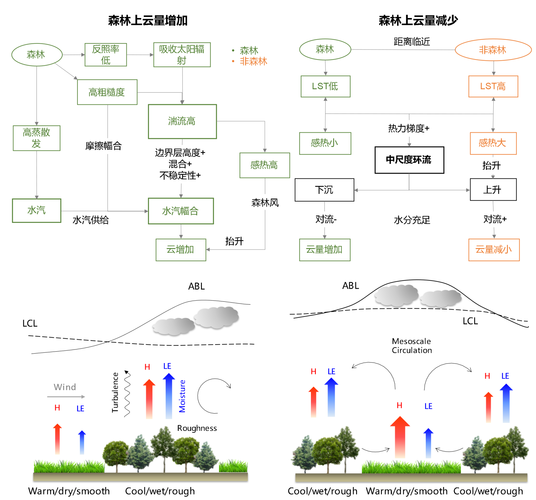图2 森林对云量的不同影响机制:(a)森林增加云量,(b)森林减少云量