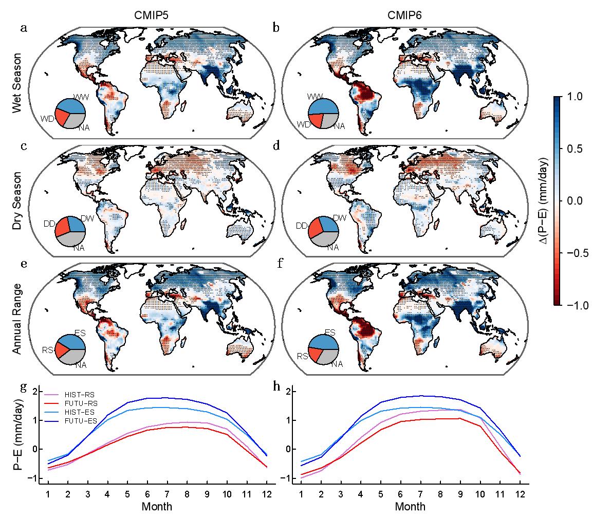 地表可用水量(降水减蒸发,P-E)是反映气候干湿程度的关键指标,对区域水资源、农业生产和生态系统稳定性具有重要影响。热力学理论指出,随着全球变暖,大气中水汽含量上升,水汽输送增强,这会促使干的地区/季节变得更干,而湿的地区/季节变得更湿。地表可用水量季节变率增强将使得水资源在年内分配更不均衡,导致湿季更容易出现洪涝灾害,而干季更容易发生干旱事件,给区域水资源管理和调度带来严峻挑战和压力。