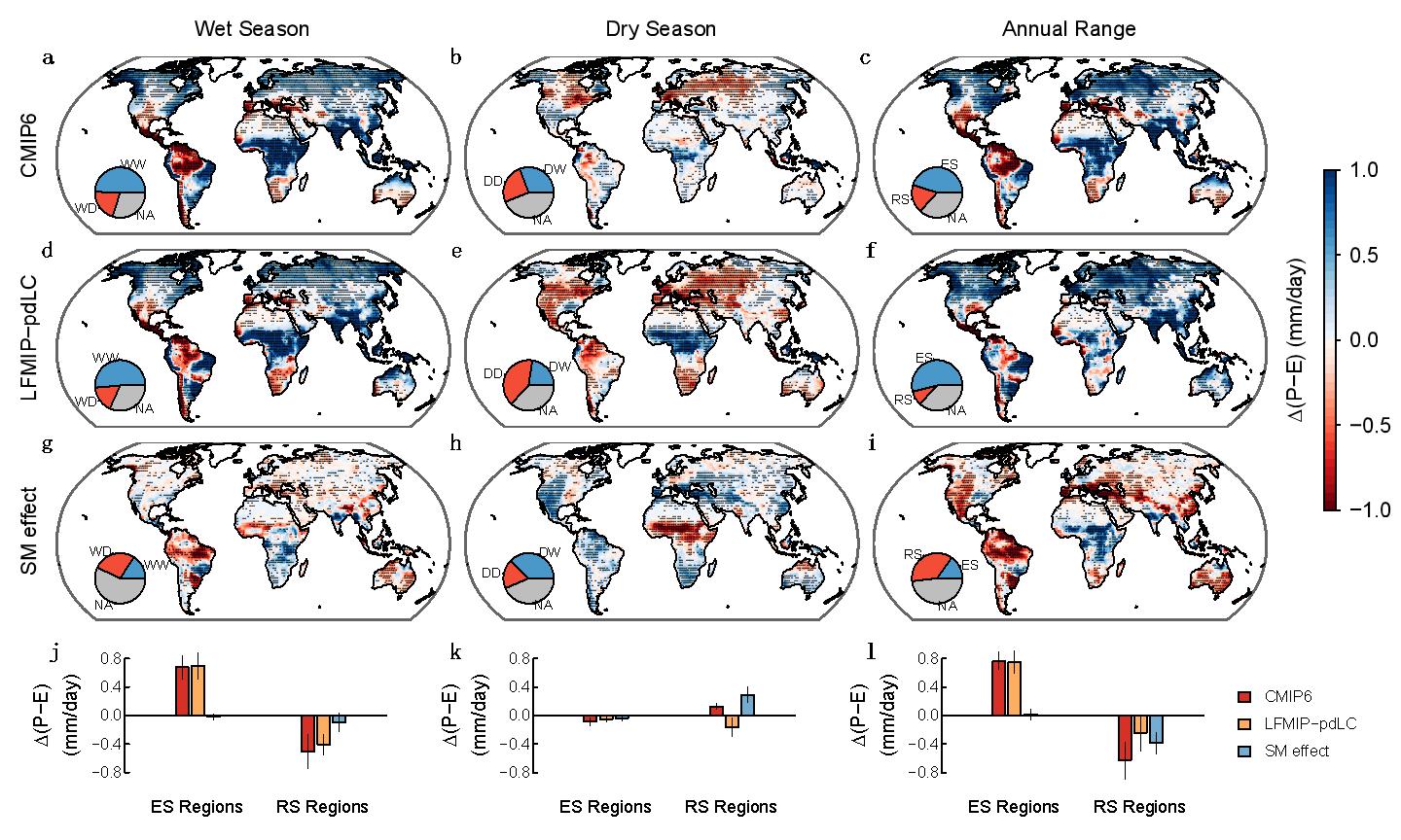 图2. 土壤水-大气反馈对地表可用水量(P-E)季节变率的影响。(a-c) CMIP6模式中未来P-E季节变化特征;(d-f) 气候变化等非土壤水因素对P-E季节变化的影响(LFMIP-pdLC陆气反馈模型实验中土壤水趋势和季节变率保持不变);(g-i) 土壤水-大气反馈对P-E季节变化的影响;(j-l) 季节变率增强(ES)和减弱(RS)区域面积加权平均P-E季节变化特征及其受气候变化和土壤水-大气反馈的影响。