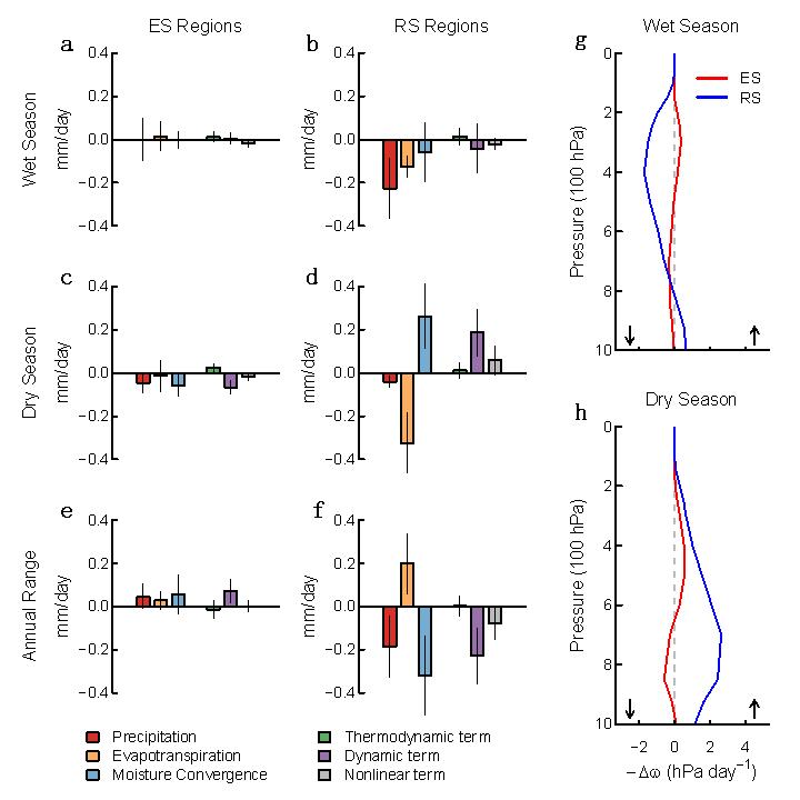 图3. 土壤水-大气反馈对地表可用水量(P-E)季节变化的影响。(a-f) 土壤水对P-E的影响及其热力学和动力学机制。(g-h) 土壤水变化对大气垂向上升速率(-w)的影响。ES和RS分别表示图2c中季节变率增强和减弱的区域。