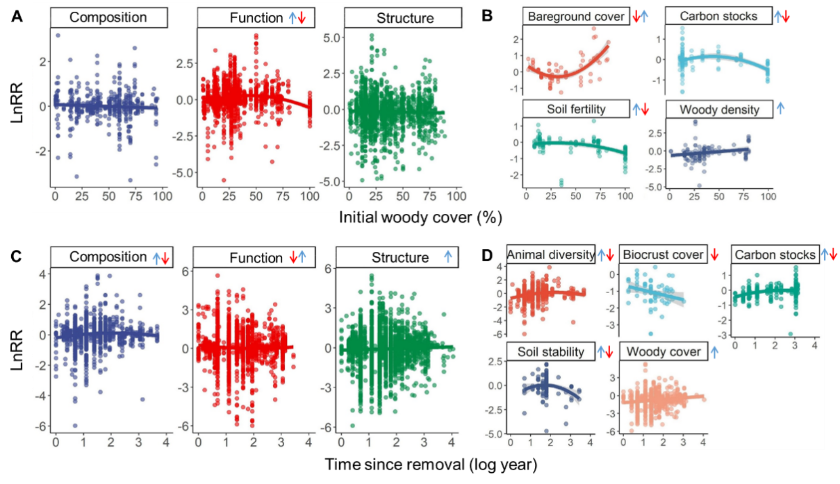 图4. 灌木移除效果随灌丛化程度和灌木移除时间的变化趋势。(A-B)表示灌木移除对生态系统组成、功能、结构和不同的生态指标的影响随移除前灌丛盖度(灌丛化程度)的变化趋势;(C-D)表示灌木移除对生态系统组成、功能、结构和不同生态指标的影响随灌丛盖度(灌丛化程度)的变化趋势;研究采用LnRR ± 95%置信区间表征灌丛化和灌木移除的影响,曲线采用线性回归或者二次多项式回归进行拟合。