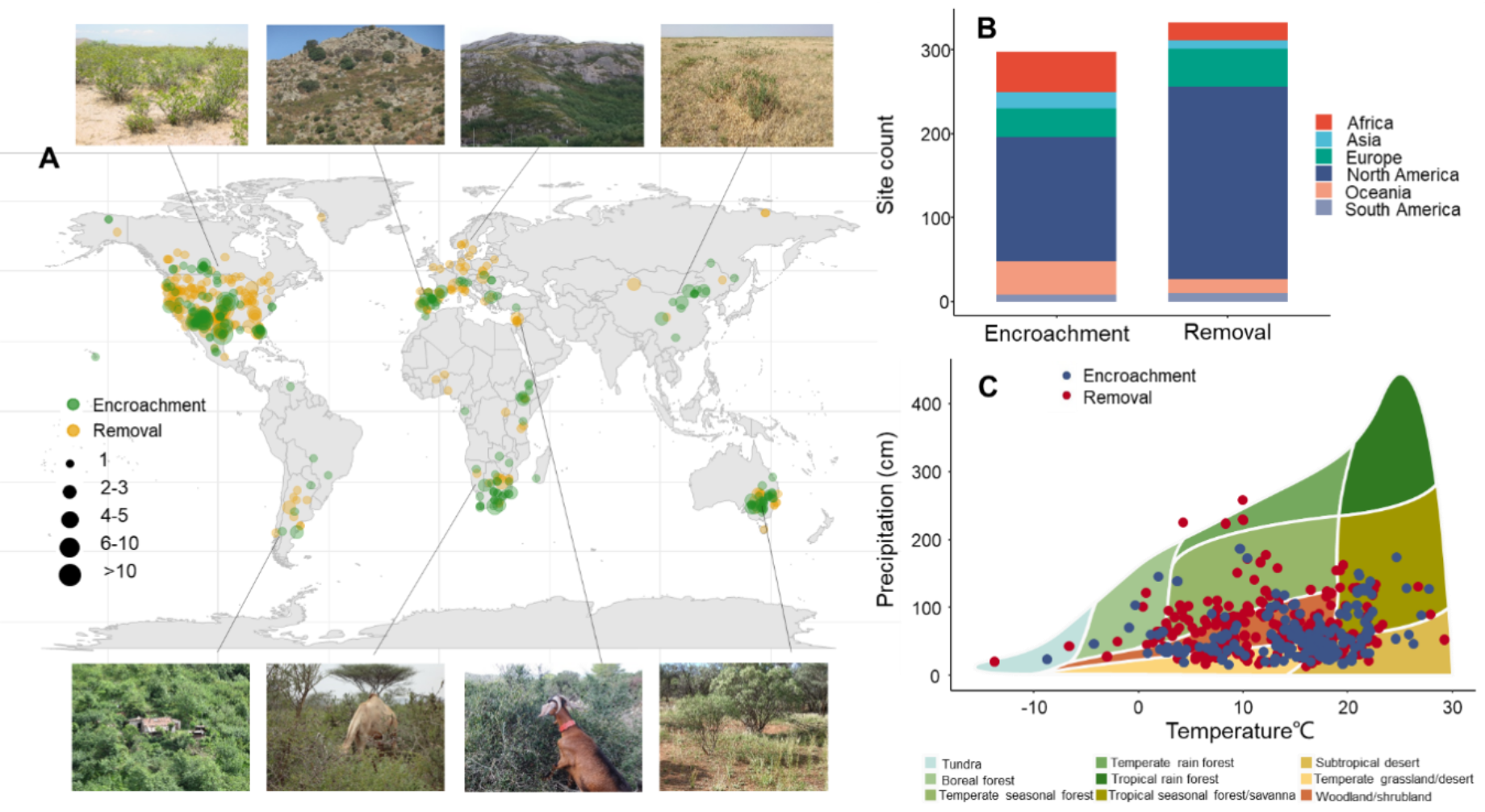 图1. 灌丛化(encroachment)和灌木移除(removal)在(A)全球范围,(B)各大洲,(C)不同生态系统的分布。