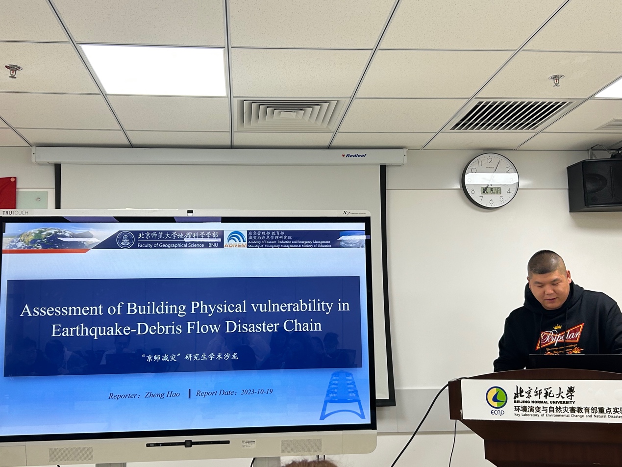 第一位主讲人郑浩同学进行了“Assessment of Building Physical Vulnerability in Earthquake-Debris Flow Disaster Chain”报告,为同学们提供了有关地震-泥石流灾害链中建筑脆弱性评估的新思路。研究以采用力学分析方法,建立了地震-泥石流灾害链中建筑物物理易损性评价模型,对北川县建筑物进行易损性评价。通过对不同易损性评估方法的比较,发现灾害链过程下建筑物的物理易损性不等于对单一灾害易损性的统计总和,意味着在灾害链过程中建筑物的结构特性和易损性发生了变化。研究结果为理解地震-泥石流灾害链中的建筑脆弱性以及其他灾害链下的建筑脆弱性提供了综合的解释。