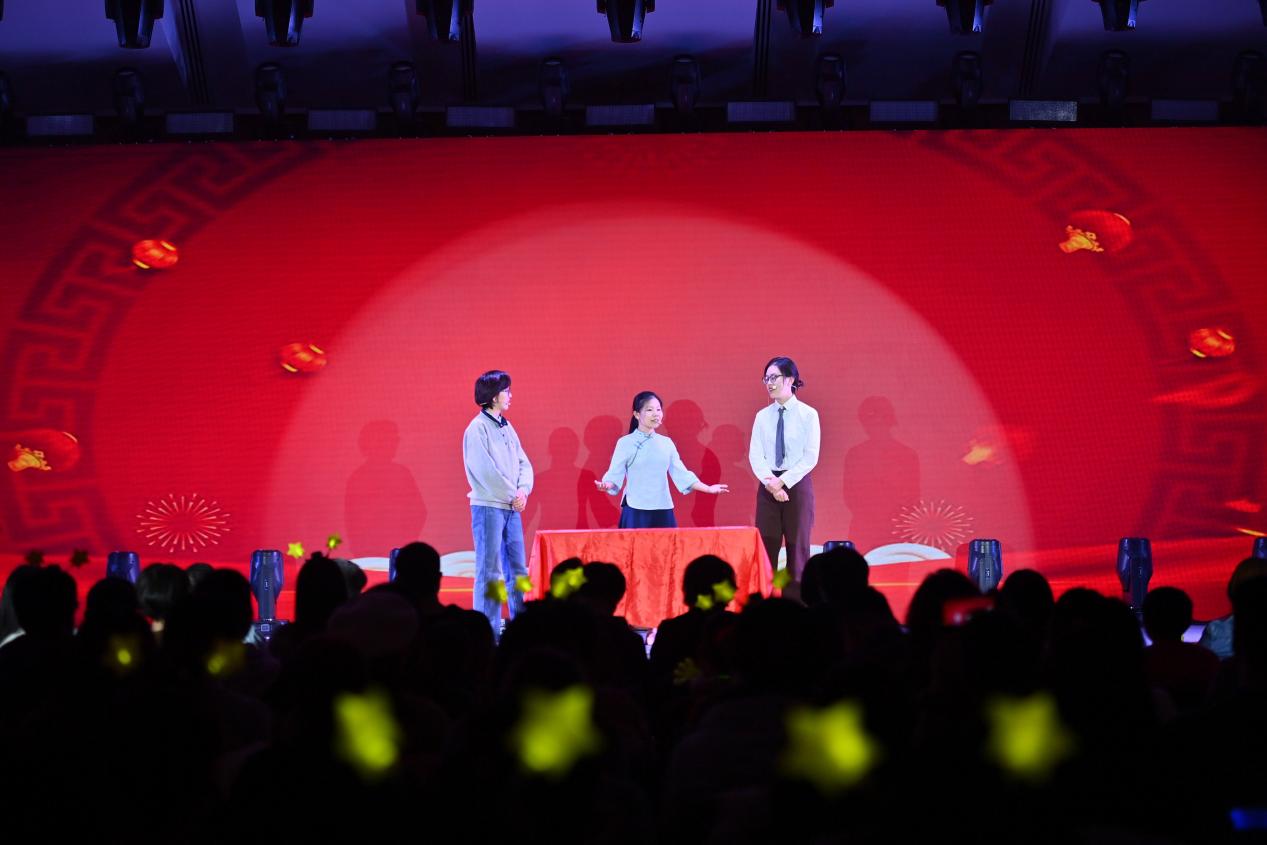 万人欢洽舞霓裳,回味悠然伴吉祥。第二板块“纳福起舞”紧随而至。用舞蹈阐释友情,用节拍带来温暖,在现代舞《Imaginary Friend》中,舞者翩然起舞,展示内心深处的温暖与坚持;在演出中欢笑,在欢笑中深思,脱口秀《鱼和熊掌》用高超的语言技术,为我们带来了幽默与哲理兼具的精彩表演,用笑声驱散冬日寒冷;跨越光年,寻觅真情,独唱《光年之外》歌声穿透心灵,传递着情感和力量;传递情感,展现魅力,由地理研舞队带来的舞蹈《Kiss of Life》以极具张力的表演,展示出独有的青春活力。