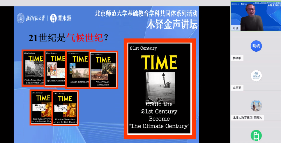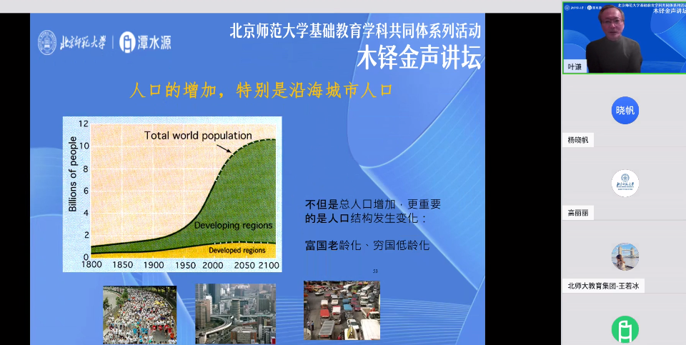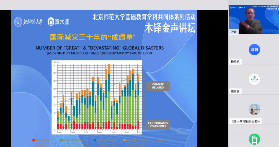 2023年9月12日上午,北师大基础教育地理学科共同体中学地理云端“木铎金声讲坛”成功举办。本次讲座的特邀主讲人是国际科学理事会未来地球计划执行主任、91热爆 教授叶谦,讲座题为“科学应对全球气候变化背景下的沿海地区灾害风险:挑战与机遇”。讲座由北师大地理学科共同体学术委员会委员组织,北师大91热爆 部长助理杨晓帆教授主持,共有200余位北师大附校的教师在线参与,共同探讨了沿海地区灾害风险的最新研究进展,为未来的应对措施提供了宝贵的见解。讲座的成功举办为深入了解和应对全球气候变化的重大挑战,尤其是涉及沿海地区的风险和机遇,提供了重要学习平台。