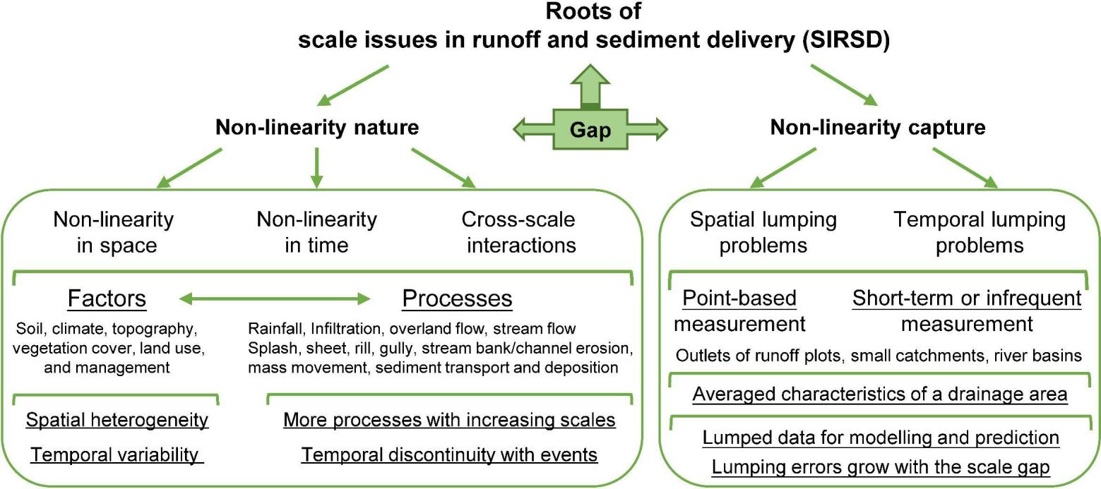 该研究认为,水沙运移中的尺度问题源自于径流和泥沙跨尺度输移过程的非线性特征与人类现有测量手段难以捕捉这种非线性特征之间的矛盾。径流深或径流系数 (r)、侵蚀模数 (SE)、输沙模数 (SSY) 和泥沙输移比 (SDR) 的空间尺度效应在不同机制的作用下表现出不同的模式。超渗产流机制可以解释径流 (r) 与汇水面积 (A) 之间的反比关系,而蓄满产流机制可以解释径流 (r) 随汇水面积 (A) 增加而增加的正相关关系。在坡面尺度上,以细沟侵蚀过程为主导的情况下土壤侵蚀模数 (SE) 随坡长 (L) 的增加而增加,而细沟间侵蚀过程为主导的情况下土壤侵蚀模数 (SE) 随坡长 (L)的增加呈减小趋势。在流域尺度上,以坡面侵蚀过程为主的地区输沙模数 (SSY) 通常随汇水面积 (A) 的扩大而减小;但在沟道/河岸侵蚀过程为主的地区输沙模数 (SSY) 随汇水面积 (A) 的增大呈增加趋势。但随着流域面积的扩大,因下游沉积过程增强,一般而言泥沙输移比 (SDR) 会随汇水面积 (A) 的增大而呈减小趋势;而当下游额外出现大量沙源或侵蚀过程增强时,则会出现泥沙输移比 (SDR) 随汇水面积 (A) 的增大而增加的反常现象。土地利用、植被、地形、气候、岩性和土壤特征的空间分布变异性,可以导致这些尺度效应关系呈现出非线性的复杂模式。因此,不建议基于其他地区开发的经验方程来通过空间尺度大小估算侵蚀或输沙。此外,考虑到全球气候和土地利用的持续变化,现有的尺度效应模式或方程可能已经发生改变并且需要更新。