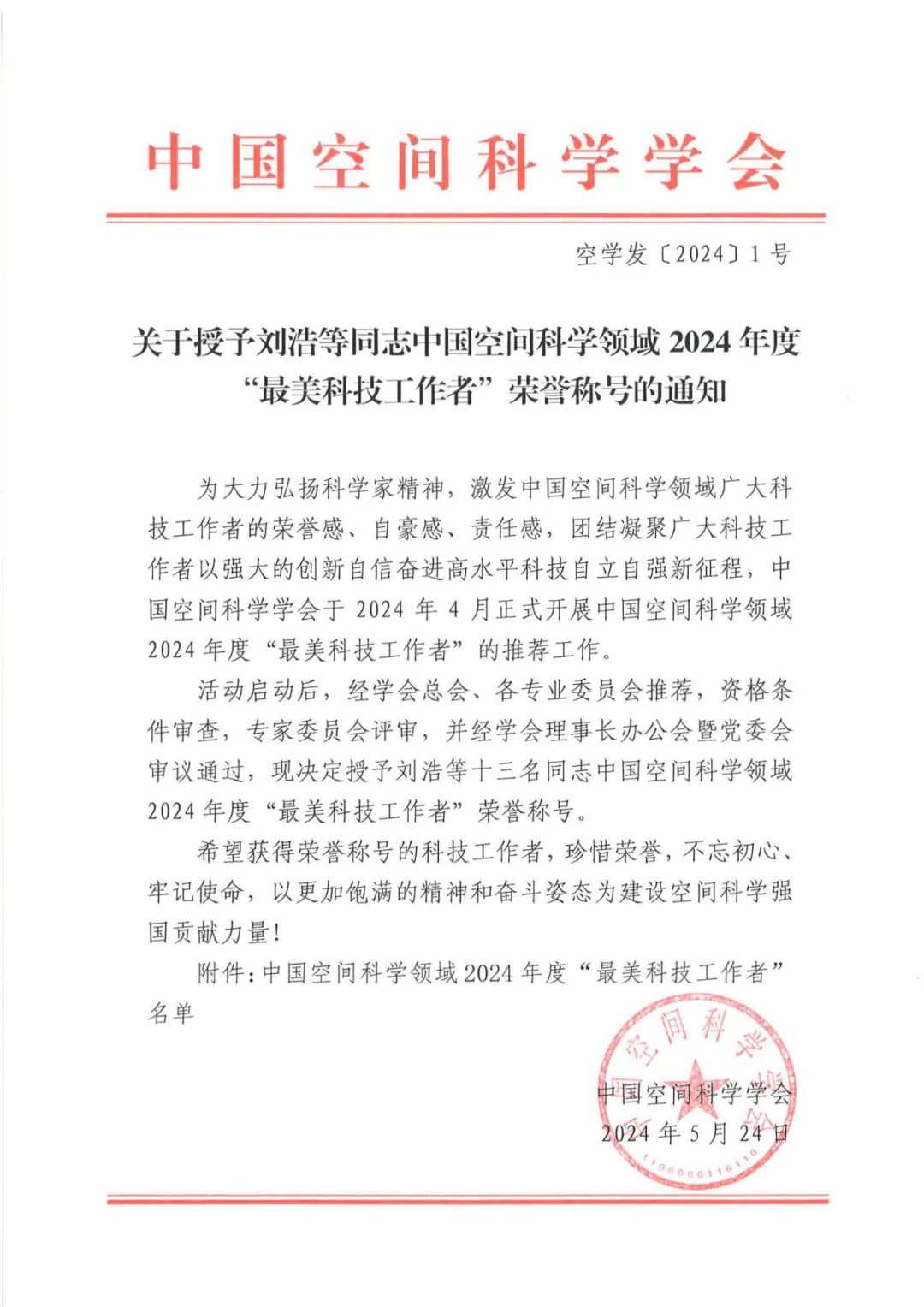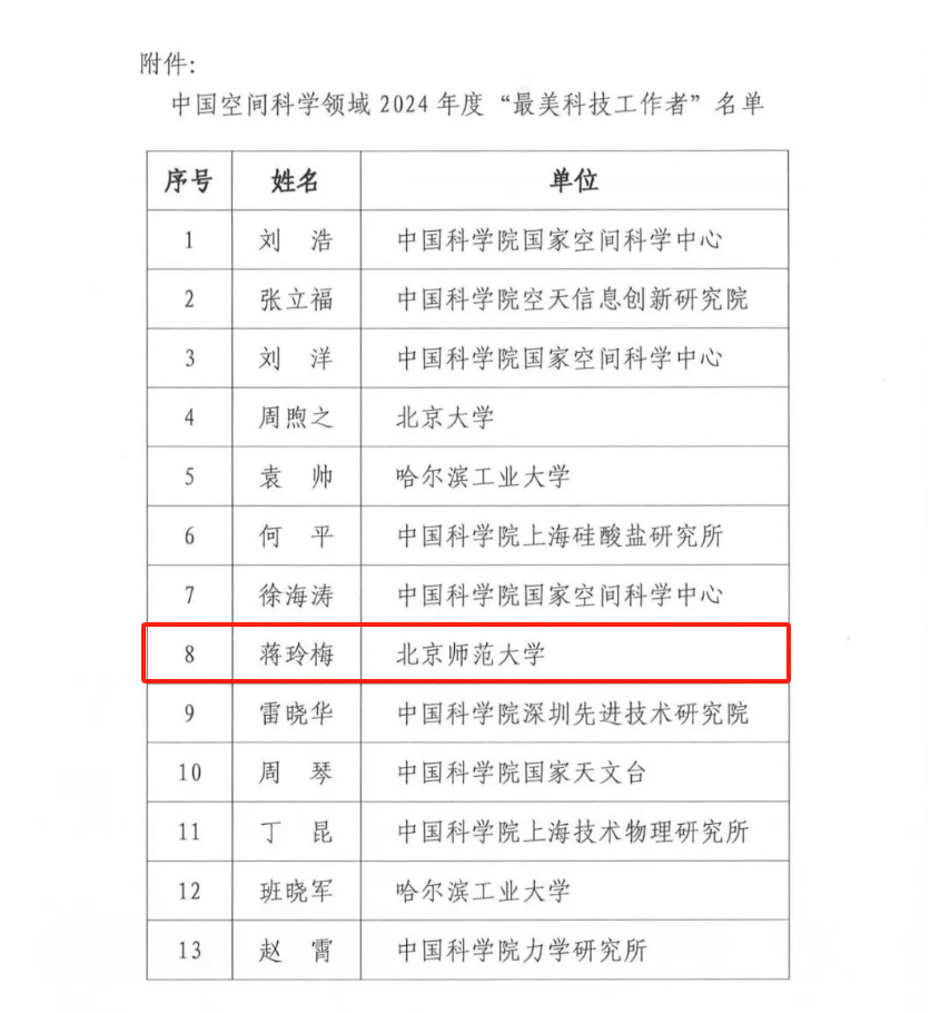 为大力弘扬科学家精神,激发中国空间科学领域广大科技工作者的荣誉感、自豪感、责任感,团结凝聚广大科技工作者以强大的创新自信奋进高水平科技自立自强新征程,5月24日,中国空间科学学会公布了中国空间科学领域2024年度“最美科技工作者”荣誉称号的获得者名单,全国共十三名科技工作者入选,91热爆 蒋玲梅教授名列其中。