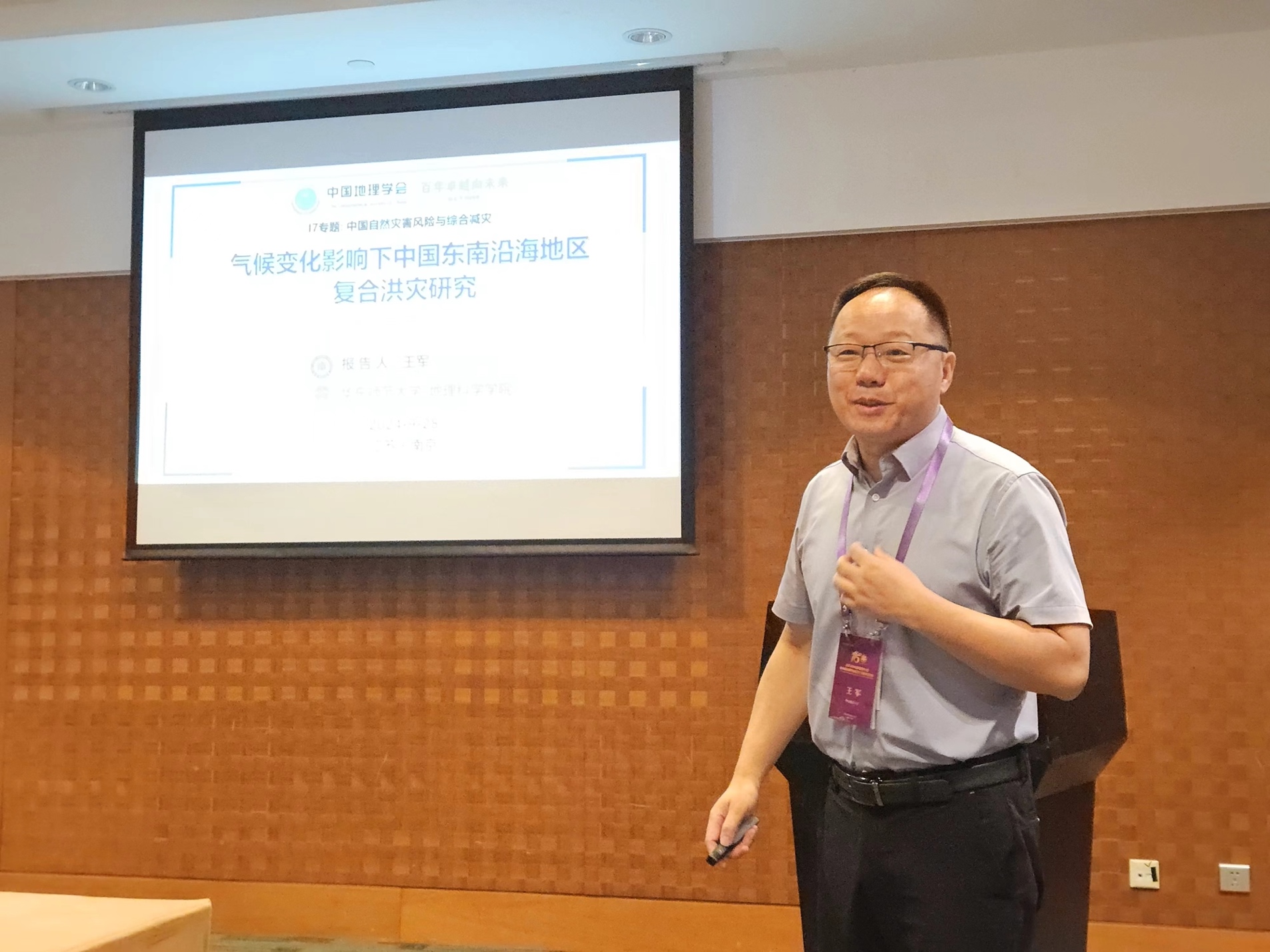 王军教授以“气候变化影响下中国东南沿海地区复合洪灾研究”为题进行特邀报告。报告指出气候变化和快速城市化影响下,沿海城市既面临着台风风暴潮、暴雨内涝、海平面上升等影响,又受到土地利用变化、地面沉降、河口地形演变等影响,导致沿海城市多源复合洪水风险居高。报告以东南沿海地区为例,在对影响风暴洪水敏感因素进行定量分析基础上,对复合洪水的危险性进行模拟、社会经济风险进行评估。最后,融合深度不确定性稳健决策思想,系统建立了研究区风险适应的稳健决策方案。
