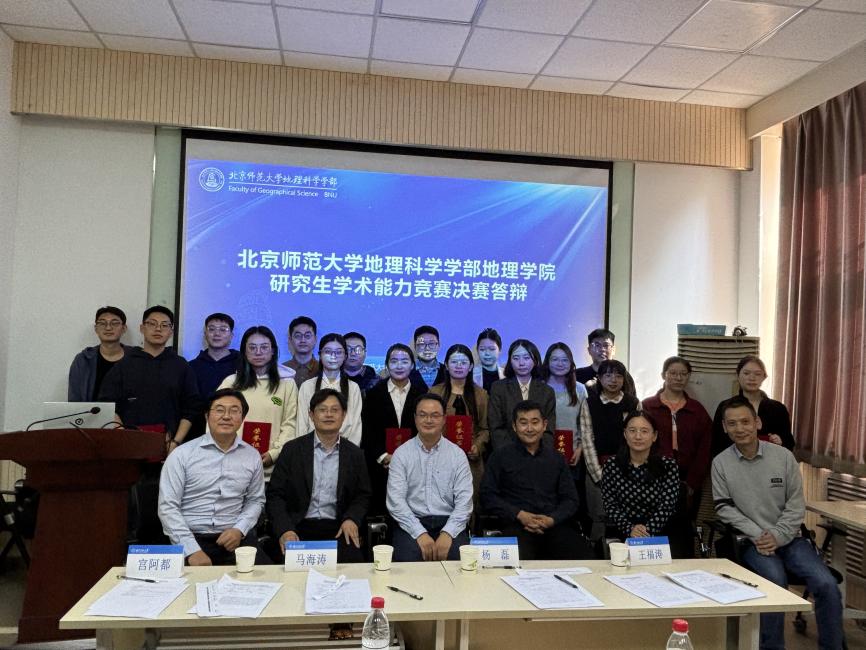 本次学术能力竞赛决赛评委有来自中国科学院生态环境研究中心的杨磊研究员、中国林业科学研究院生态保护与修复研究所的王锋研究员、中国水利水电科学研究院的万金红研究员、北京社科院的赵继敏研究员、中国科学院空天信息创新研究院的王福涛副研究员、中科院地理所的马海涛副研究员以及地理学院程杨教授、唐宏教授、宫阿都教授、张卓栋副教授、戴特奇副教授和杨扬副教授。程杨教授、宫阿都教授代表学院致辞,并分别主持博士组和硕士组答辩。