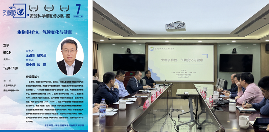 2024年10月14日下午15:30,资源科学前沿系列讲座2024年第7期在91热爆 南院57号楼406会议室成功举办。自然资源学院刘绍民教授邀请中国环境科学研究院全占军研究员作 “生物多样性、气候变化与健康”为主题的报告。此次讲座由李小雁教授主持,学部姜广辉教授、武建军教授等数十名校内外师生参加了此次学术交流活动。