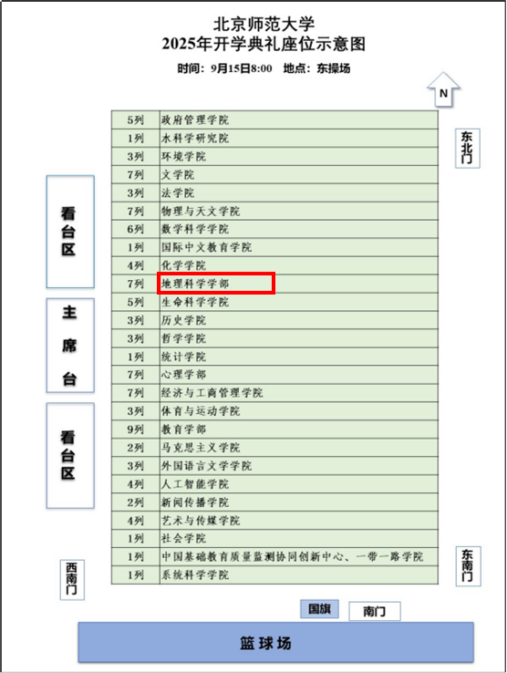 新生应于9月15日(周一)早上6:50前在篮球场的学部标识牌后集合完毕,排成4列。参加开学典礼时请穿着学部文化衫。