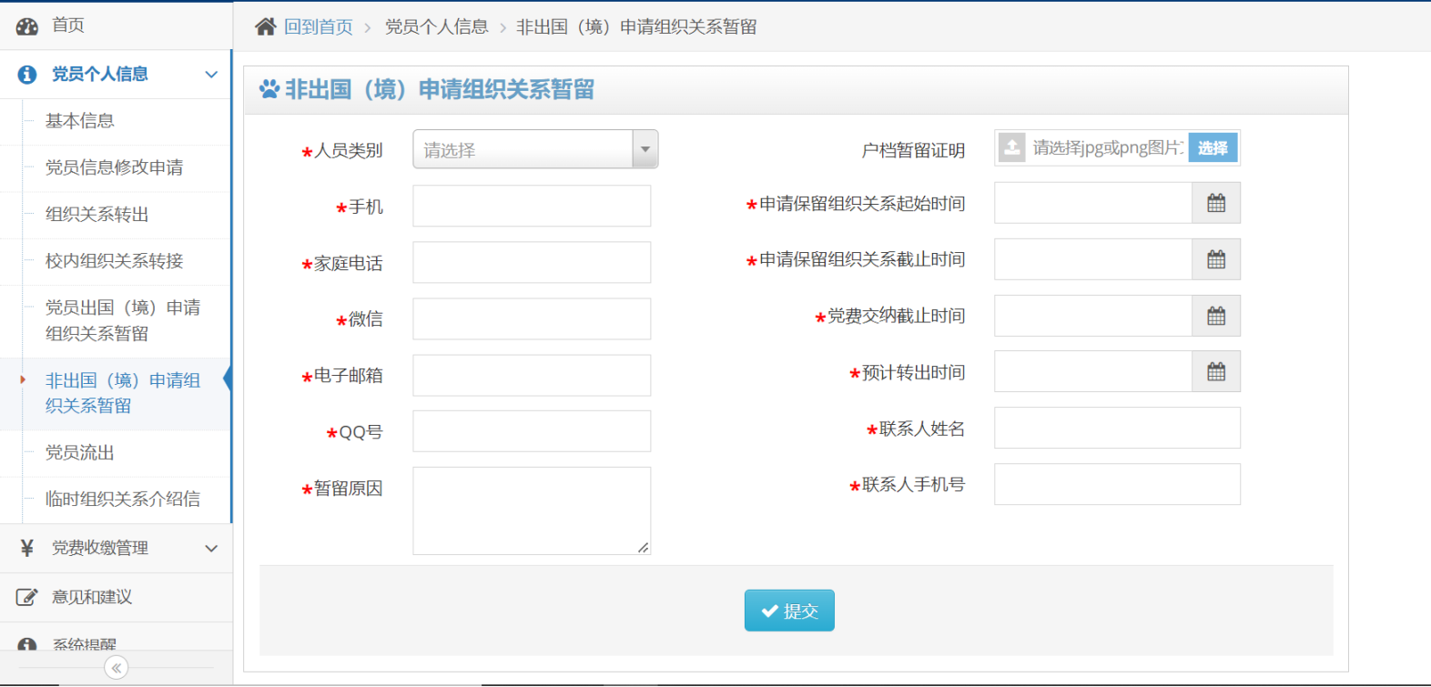 操作:左侧的“党员基本信息—非出国(境)申请组织关系暂留”