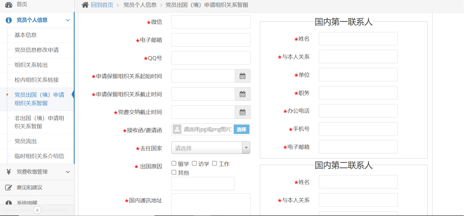 操作:左侧的“党员基本信息—出国(境)申请组织关系暂留”信息