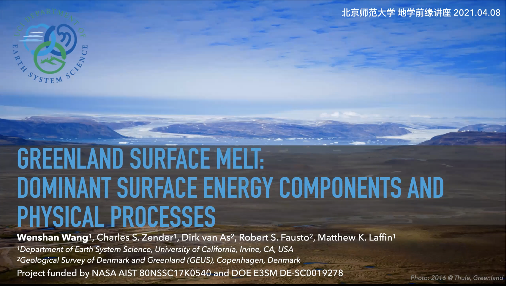 本次讲座邀请到了加州大学尔湾分校地球系统科学系汪文珊副研究员,报告题目为“Greenland surface melt: dominate surface energy components and physical processes”,主要探讨了格陵兰岛表面海冰融化的物理机制。