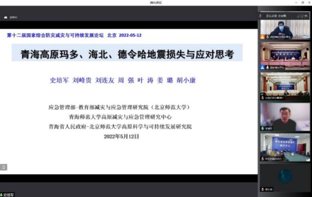 应急管理部—教育部减灾与应急管理研究院副院长、国家减灾专家委副主任史培军教授应邀主持论坛,并作“青海高原玛多、海北、得令哈地震损失与应对思考”主题报告。史培军教授系统介绍了青海高原近期三次地震的基本概况,重点分析了青海高原地震对地质环境、水文环境、冻土环境造成的总和影响,并从地震活跃期和地质构造带对青海高原地震灾害风险进行了预估,同时从地震活动监测、灾害链应对和灾害恢复重建等方面提出了相应的防范建议。报告还特别强调了在国家生态屏障的青藏高原,对其地震造成的损失评估时,要包括地震造成生态系统价值损失的评估。