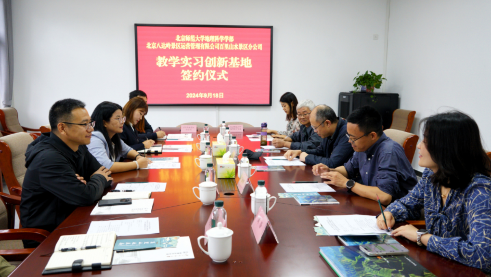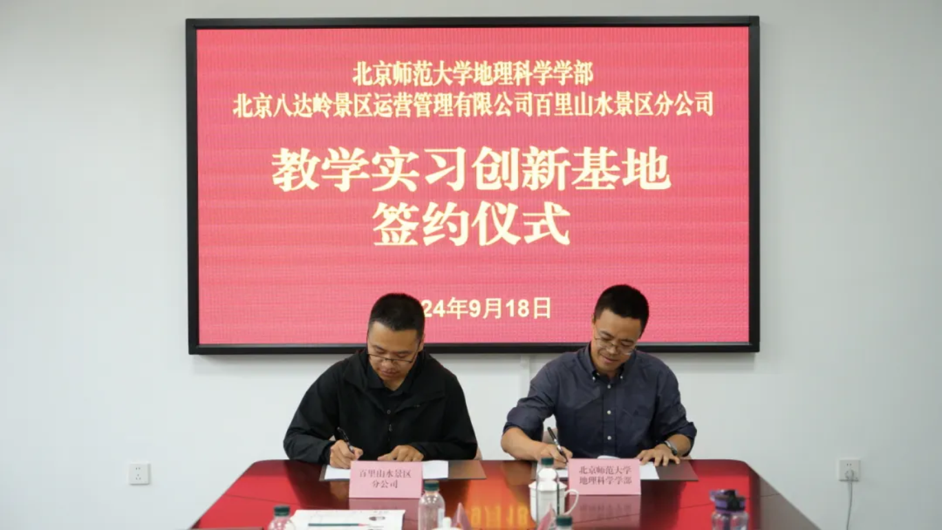 会后,双方举行了签约仪式及揭牌仪式。学部副部长潘峰华、百里山水景区分公司经理刘鑫,分别代表校企双方签署教学实习基地协议。学部常务副部长吴云峰、八达岭文旅集团副总经理蔡子翠,分别代表校企双方共同为“教学实习创新基地”揭牌。