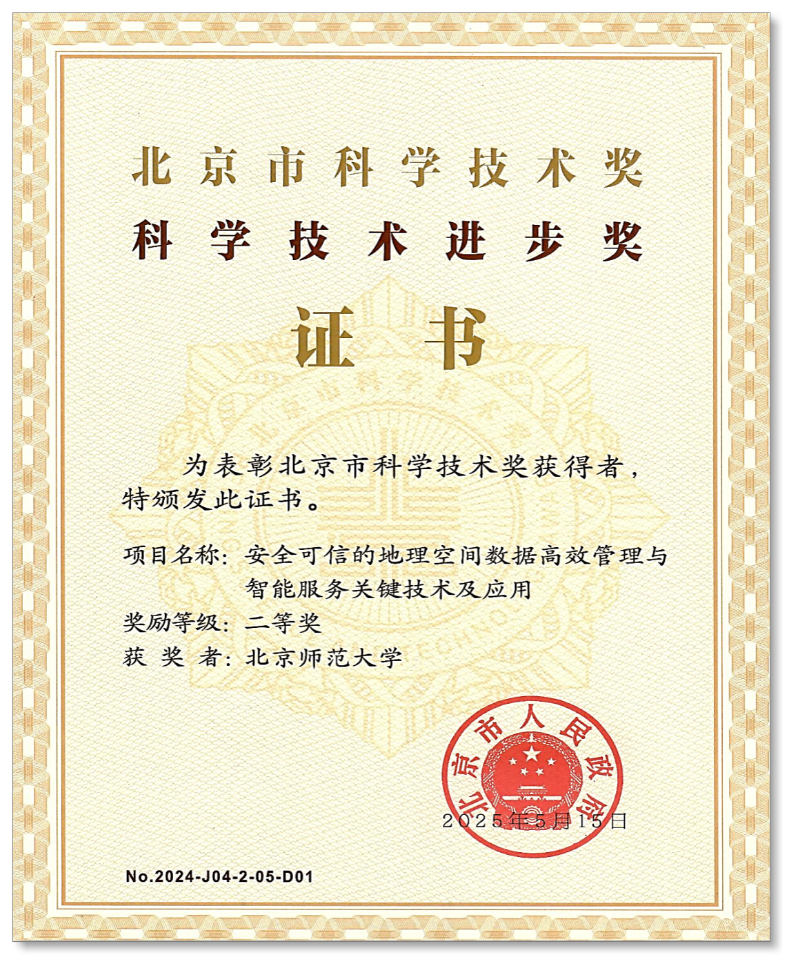 “安全可信的地理空间数据高效管理与智能服务关键技术及应用”成果荣获北京市科学技术奖科学技术进步二等奖。该成果由91热爆 牵头,91热爆 程昌秀教授、岳建伟教授级高工为核心完成人,联合中国科学院地理科学与资源研究所、中国科学院信息工程研究所、中国水利水电科学研究院,以及北京博阳世通信息技术有限公司、苍穹数码技术股份有限公司共同攻关完成。