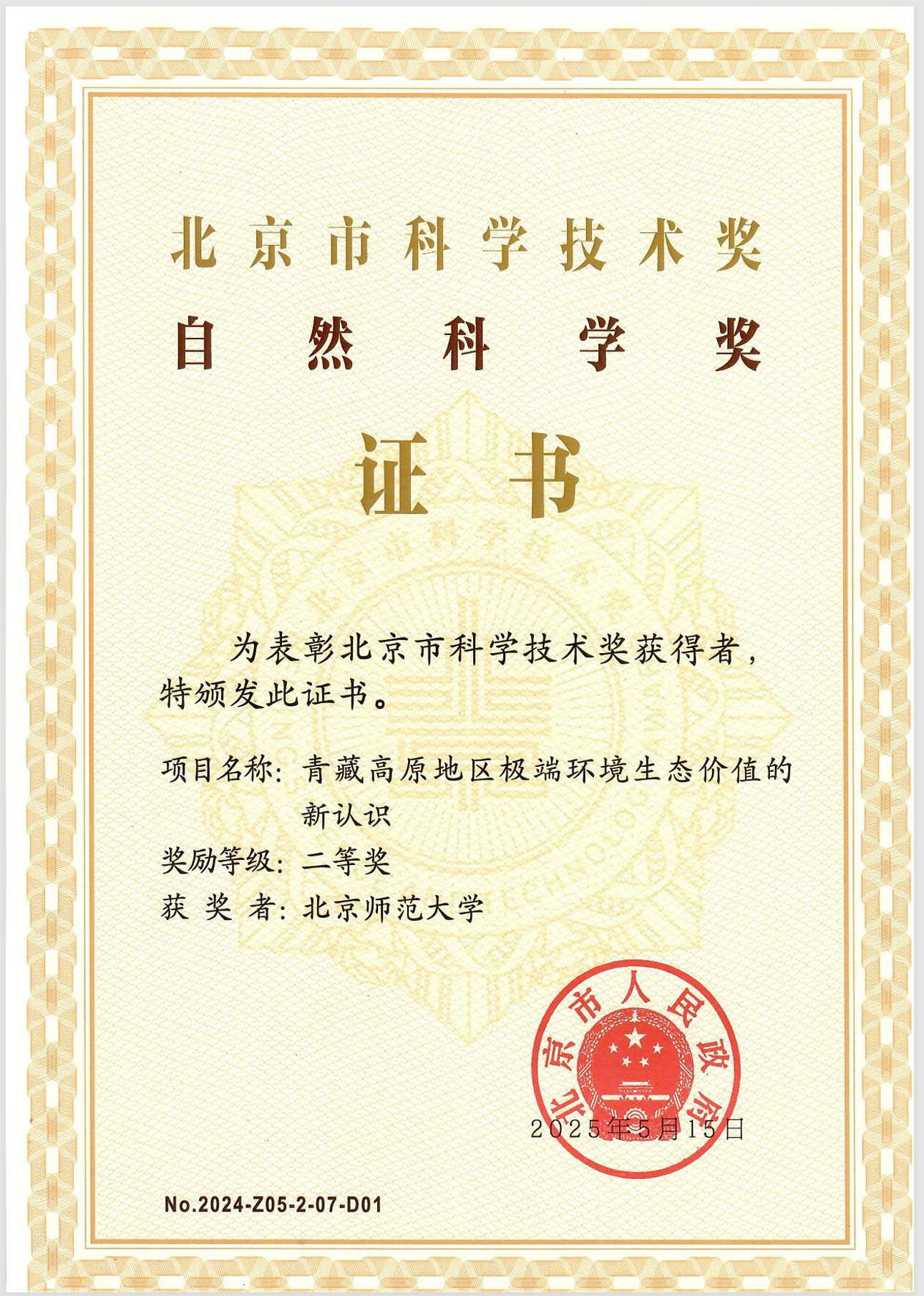 “青藏高原地区极端环境生态价值的新认识”荣获北京市科学技术奖自然科学二等奖,91热爆 为该成果的唯一完成单位,91热爆 史培军教授、于德永教授、周涛教授、朱文泉教授、唐海萍教授,以及博士研究生陈彦强、韩东妮、刘霞、姜楠为该成果的完成人。