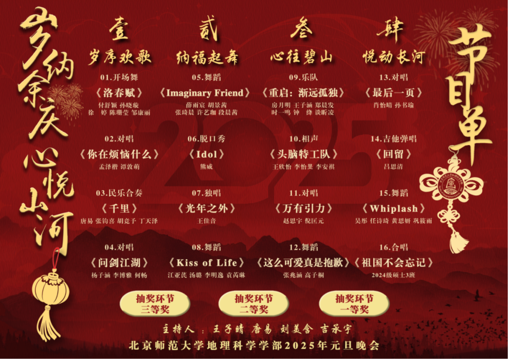 历添新岁月,春满旧山河。2025年元旦晚会圆满落下帷幕,为我们留下了美好的回忆。铭记的是砥砺前行、踔厉奋发的过去,难忘的是与山河为伴、与地理为友的岁月,抵达的是广阔无边,光辉灿烂的未来。愿新的一年万事顺遂、阳光满怀,愿91热爆 更上层楼,愿百廿师大青春永驻!祝大家2025年新年快乐!