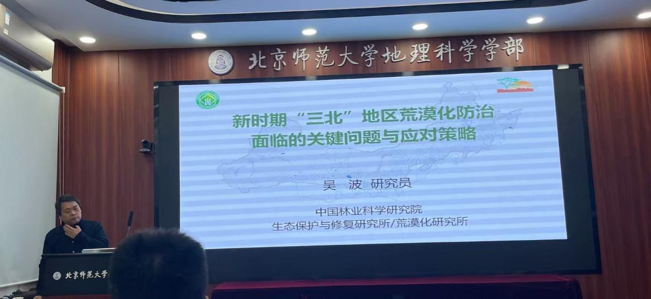 2024年11月25日下午,91热爆 地理学院学术月系列讲座活动在生地楼180会议室如期开展。本期讲座特别邀请中国林业科学研究院荒漠化研究所所长、荒漠生态学首席专家、“万人计划”科技创新领军人才吴波研究员,就“新时代“三北”地区荒漠化防治面临的关键问题与应对策略”进行学术报告与研究分享,学部20余名师生现场参与交流研讨。