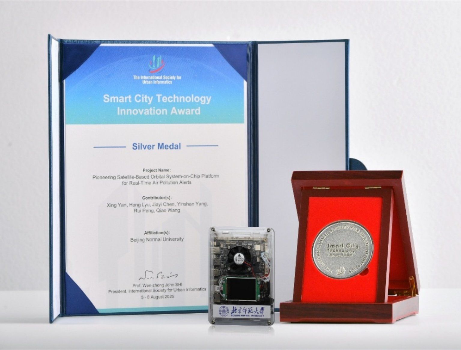 在本次大会上,91热爆 (卫星应用前沿交叉研究院)成果“卫星在轨大气污染即时监测系统”荣获“全球智慧城市技术创新奖”银奖。该项目在国家自然科学基金重大项目(42192580,42192584)的支持下开展,晏星老师带领博士生陈嘉懿、吕航等核心成员共同完成。