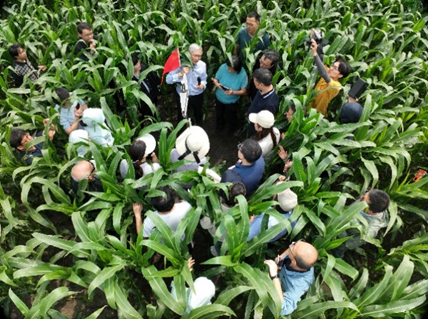 现场考察过程中,刘宝元教授逐一详细介绍了解决榜单任务的研究思路和具体实施。水力侵蚀观测设有世界上坡长最长的农地径流小区,以解决黑土地长坡侵蚀问题,应用了中国自主研发的国际上最先进的自动化仪器和远程传输系统。风力侵蚀发明了“风蚀圈”观测风蚀速率,考核组成员不顾炎热,走进一人多高浓密的玉米地观测场地。当听到刘宝元教授介绍他发明的仪器设计思想和观测设备后,来自农业部耕地质量监测保护中心的最终用户代表杨帆处长认为,有望回答困扰了他们多年的风蚀量有多少的问题。该项研究实现了在一块耕地上可以观测到多厚的表土被风吹走而流失,或被多厚的风沙堆积而沙化,突破了100多年来无法观测风蚀速率的技术瓶颈。在侵蚀退化阻控示范现场,介绍了如何通过更新农田防护林、采取等高耕作和免耕等水土保持耕作措施,实现阻控侵蚀和黑土退化。在理水调水示范现场,介绍了如何通过开挖水塘和排水渠,兼顾涝渍地治理与生物多样性、小流域“林田湖草沙”生态理念的多目标实现。考核组成员为先进的水蚀观测场、创新的风蚀观测场、坡面上蜿蜒而行的农田防护林和等高耕作所惊叹,认为是高水平的项目成果展示,最终用户代表感到很激动,认为成果对黑土耕地质量保护和高标准农田建设很有启发。