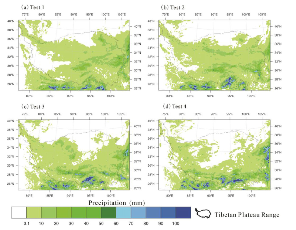 研究团队在通过统计分析得到青藏高原气象观测降水量与海拔高度呈显著相关结果的基础上,利用区域气候模式(Weather Research and Forecasting,WRF)模型,设计了四组对比实验:对照组采用青藏高原实际海拔数据,另外三组则将海拔分别降低1000米、2000米和3000米,模拟分析2020年6月16日的强对流降水过程。结果令人瞩目:随着海拔升高,降水强度和总量显著下降。结果显示,在实际海拔(对照组)下,24小时累计最大降水量仅为68.48毫米,而当海拔降低3000米后,这一数值飙升至303.18毫米,增幅超3倍;小时最大降水强度也从38.11毫米每小时提升至94.43毫米每小时。更关键的是,这一规律在2019年7月14日的另一降水案例中同样得到验证,证明了海拔影响的稳定性。
