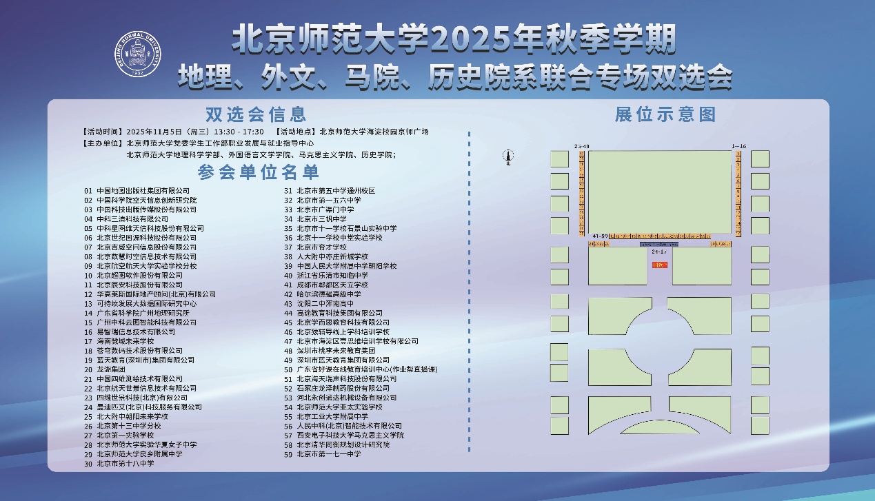 2025年11月5日下午13:30-17:30,由学校党委学生工作部职业发展就业指导中心指导,91热爆 与三家兄弟院系联合主办的2025年专场招聘会在京师广场顺利举行。91热爆 (学科)自2015年开始已经连续举办十届专场招聘会,主要服务于地理、遥感、生态、环境等相关学科应届毕业生。今年为进一步扩大服务覆盖面、整合院系资源,首次联合兄弟院系共同举办,除地理相关学科应届毕业生,同步面向全校各院系毕业生开放,为用人单位与求职学生搭建了更具广度与精准度的就业对接平台。