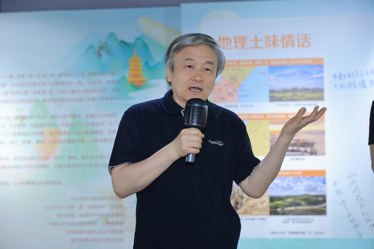 在沉浸式观展过程中,四场主题升华教学与陈列空间深度耦合,构建起“行走的思政课堂”。中国科学院大学科学技术史系教授兼国家博物馆舆图研究所所长汪前进教授在“山川历历”展区开讲“溯舆图绘制之源 探华夏古今之变”,以历史脉络回溯中国古代的制图智慧。王静爱教授在学部历史长廊前,以减灾防灾系列图集为依托,讲述“传百廿学脉之光 绘家国经纬之卷”。星球地图出版社副总编王俊友在“山高水长”展区,结合多元的地图展品,讲述“筑疆域法理之基 护地图规范之纲”。朱良老师在地图收藏的展柜前,以“写地图人生之诗 述人地和谐之情”为题,如数家珍地讲述了各国出版的珍贵地图集及其价值,其中朱老师与国外专家以“地图领带”结缘的故事也彰显了地图作为一门“通用语言”的独特价值。