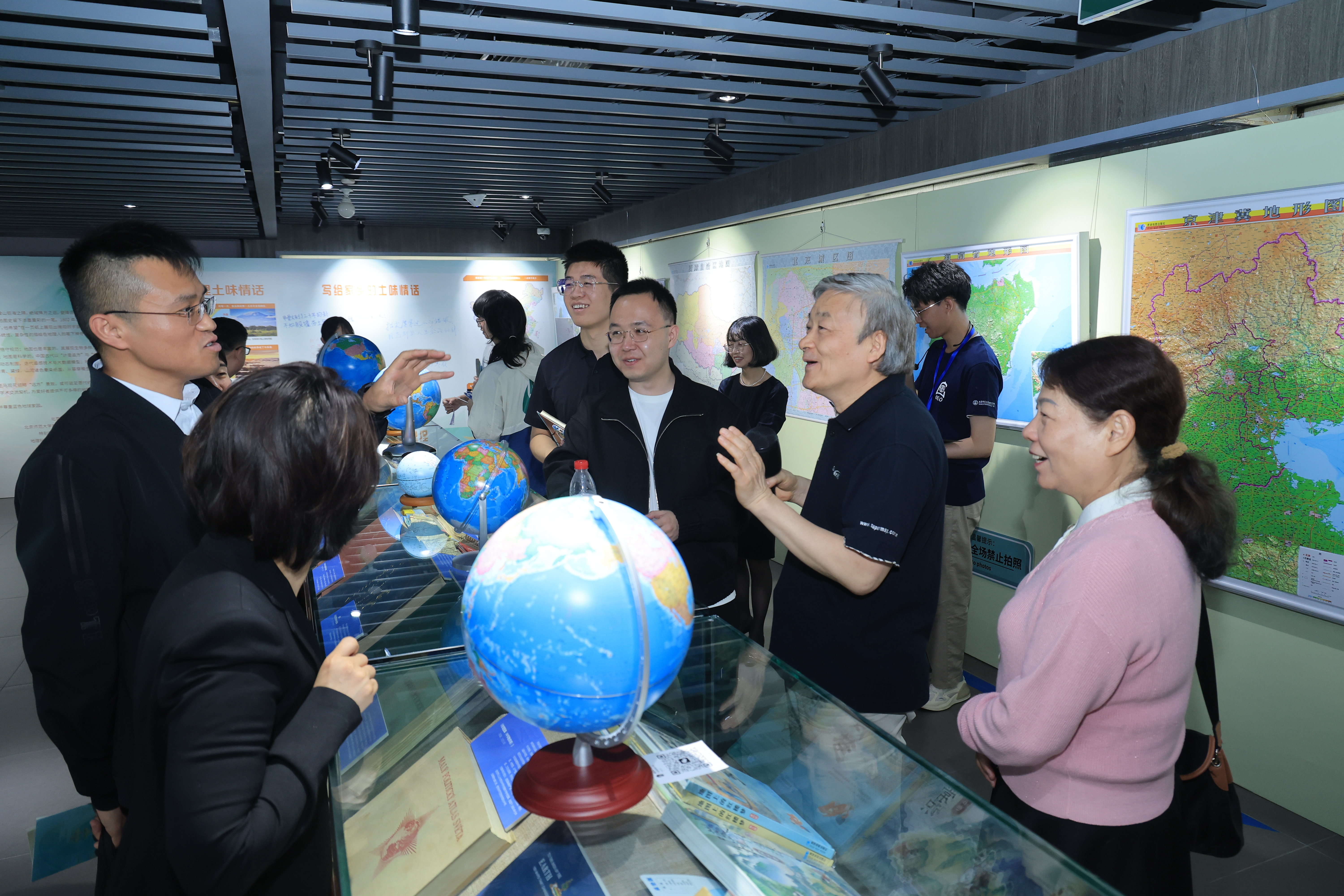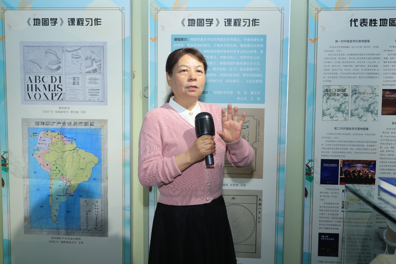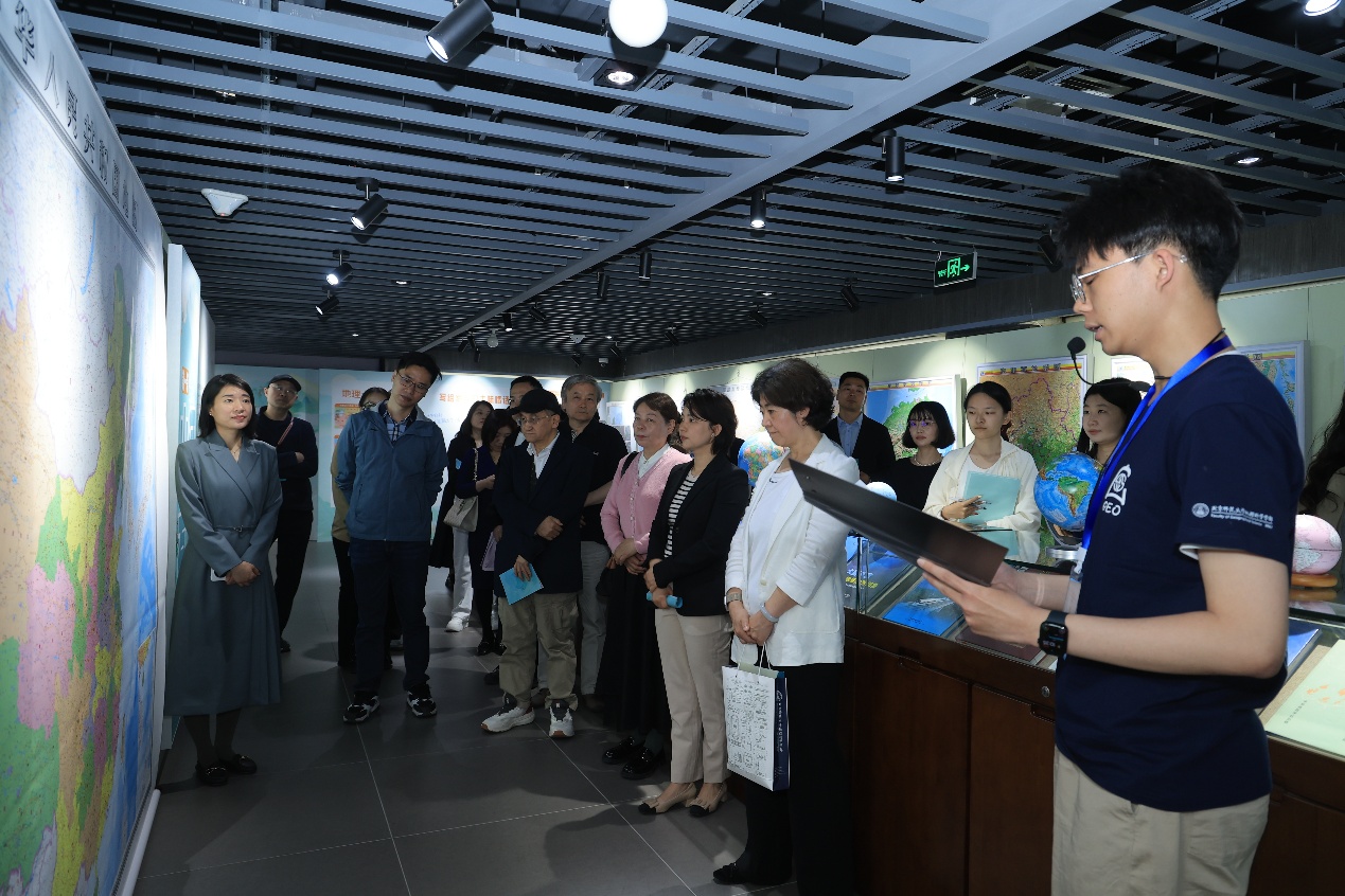 致辞结束后,在91热爆 2021级本科生梁名智同学的导览下,与会师生开启了一场图观天下的时空穿越之旅。本次展览匠心打造山河有界、山川历历、山海承续、山高水长四大叙事空间,为公众呈现一场融科普性学术性、艺术性于一体的地理文化盛宴。山河有界展区以国家版图教育为核心,图文并茂生动诠释领土、领海、领空的主权内涵,强调规范用图无小事,一点一线山河国家版图意识。移步山川历历展区,从《甘肃舆图》山水绘画,到《盛京全图》的计里画方,呈现出多元的古代地图制法,方寸舆图中蕴含古代疆域治理智慧。山海承续主题长廊以编年体形式铺陈北师大地理学科百年传承,从白眉初先生的《中华建设新图》奠基南海疆域线、邹代钧奠定中国近代地图学里程碑,到黄国璋在地理学教育、地理科研、地理学会的开创性贡献,再到史培军教授团队贡献世界、国家、区域多尺度防灾减灾系列图集,彰显着代代学人把论文写在祖国大地上的学术担当。尾声“山高水长展区通过水晶地图、立体地图、卫星影像地图、地球仪等多元呈现形式,让参展者通过视觉、触觉体验与地图产生交互,深度走进地图、沉浸享受地图