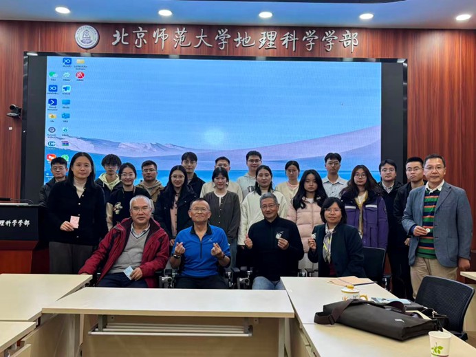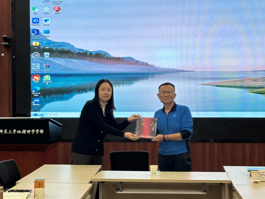 报告结束后,杨扬老师和符素华老师分别向李锦育教授赠送了地理学院的文创及土壤侵蚀研究团队编写的《土壤侵蚀研究方法》和《中国土壤流失方程》两本著作,并邀请与会师生合影留念。