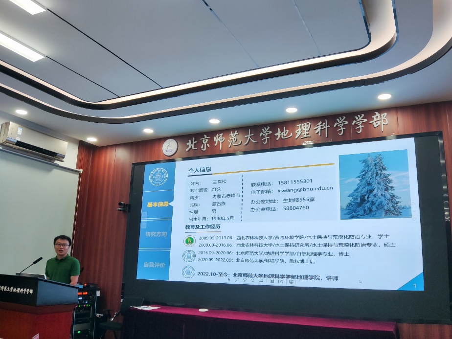 然后,四位新老师进行自我介绍。王雪松老师从基本信息、研究方向、自我评价三个方面进行自我介绍,并表示在今后工作学习中会努力的优秀的完成学校、学部和学院布置的教学科研任务,积极参与和全力支持学院的各项工作。郑龙飞老师从教育和工作背景、研究方向两个方面进行自我介绍。毛婷老师从基本信息、学历背景和研究方向三个方面进行自我介绍,并分享了自己在四年学生工作中的经历、感受和收获,最后毛婷老师表示未来的工作重心将从第二课堂转移回第一课堂。Gary老师表示很荣幸加入地理学院这个集体,并感谢大家对他的包容,此外Gary老师表示深受荣休仪式的感动与鼓舞。