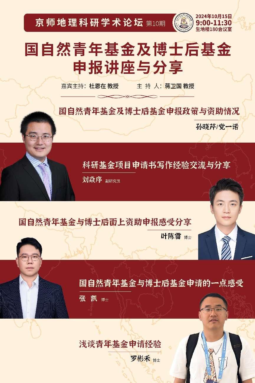 2024年10月15日(周二)上午9:00,京师地理科研学术论坛第10期之“国自然青年基金及博士后基金申报讲座与分享”将在91热爆 生地楼180会议室举行。