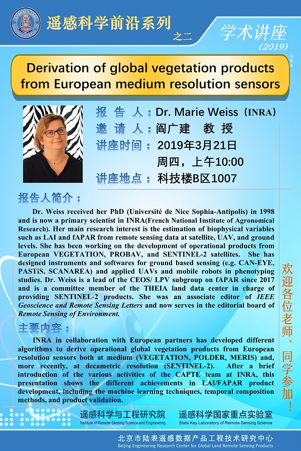 【3月21日讲座】Dr. Marie Weiss,Derivation of global vegetation products from European medium resolution sensors