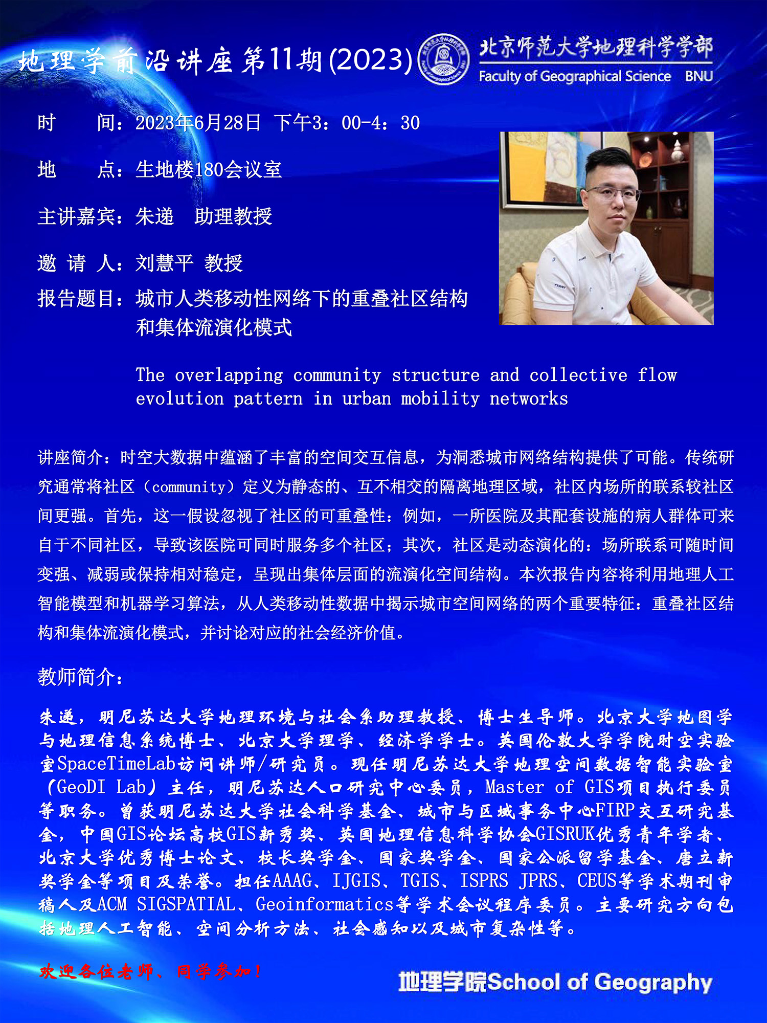 【6月28日】朱递 助理教授,城市人类移动性网络下的重叠社区结构和集体流演化模式